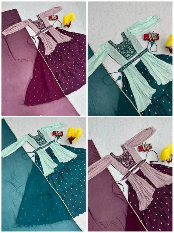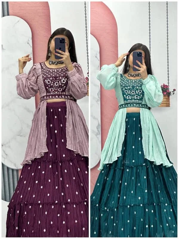 Crop Top: Chinon fabric with real hand khatali work, stitched with micro cotton lining and built-in cups. Fits sizes M–L, XL–2XL (with margin). Includes matching handwork belt. Lehenga: Chinon fabric with heavy sequin embroidery, micro cotton lining, 5.5-meter grand flair with cancan. Dupatta: Soft fabric, 2.3 meters, with a delicate finish. Quality: Premium showroom finish